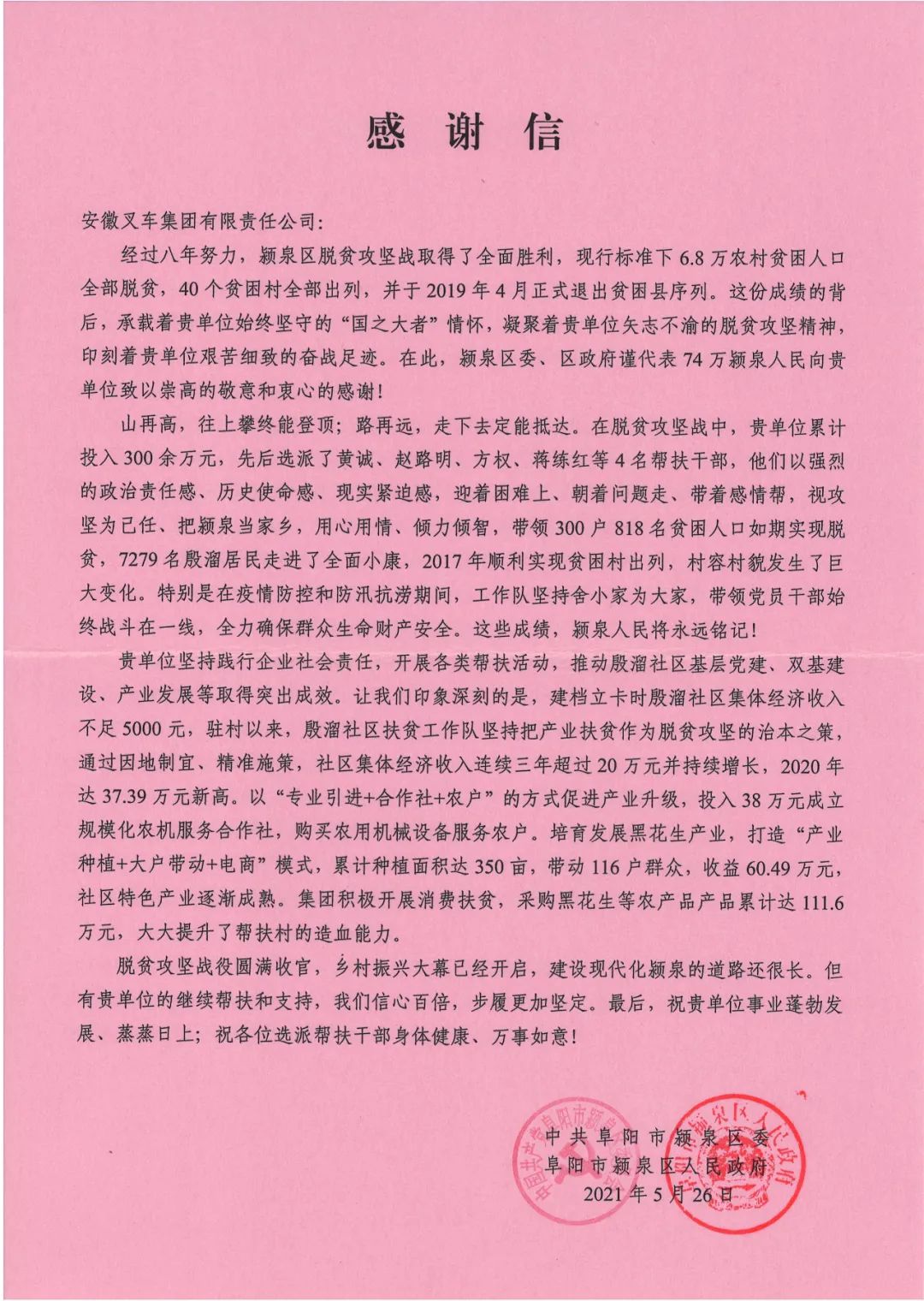 5月底,叉車(chē)集團(tuán)收到了一封來(lái)自阜陽(yáng)市潁泉區(qū)委區(qū)政府的感謝信,信中高度概括了該公司在殷溜社區(qū)駐村扶貧的成效,對(duì)叉車(chē)集團(tuán)連續(xù)多年的駐村幫扶表示感謝。