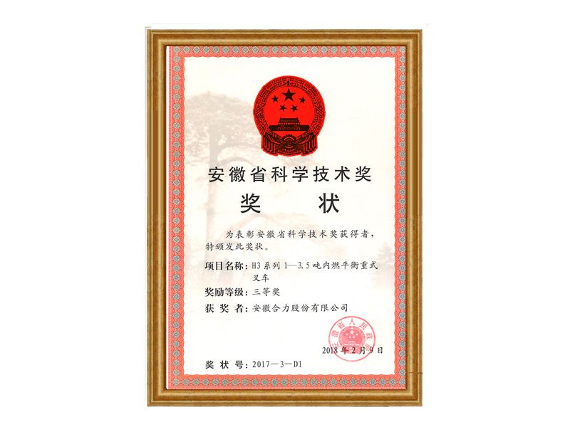 2018安徽省科學技術獎三等獎H3系列1-3.5噸內(nèi)燃平衡重式叉車